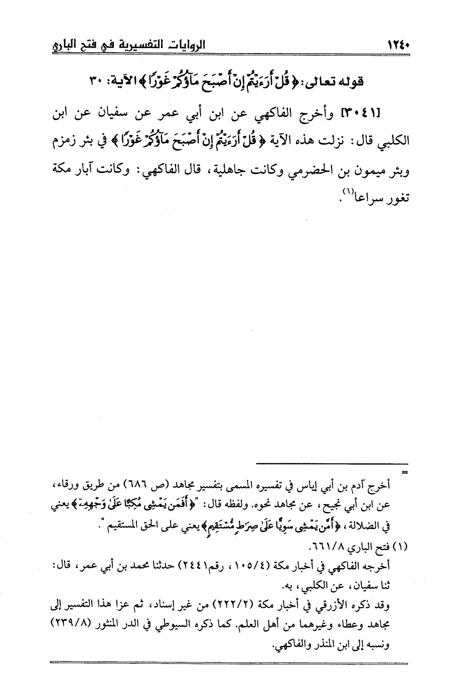 [3041] وأخرج الفاكهي عن ابن أبي عمر عن سفيان عن ابن الكلبي قال: نزلت هذه الآية {قُلْ أَرَأَيْتُمْ إِنْ أَصْبَحَ مَاؤُكُمْ غَوْراً} في بئر زمزم وبئر ميمون بن الحضرمي وكانت جاهلية، قال الفاكهي: وكانت آبار مكة تغور سراعا 1.