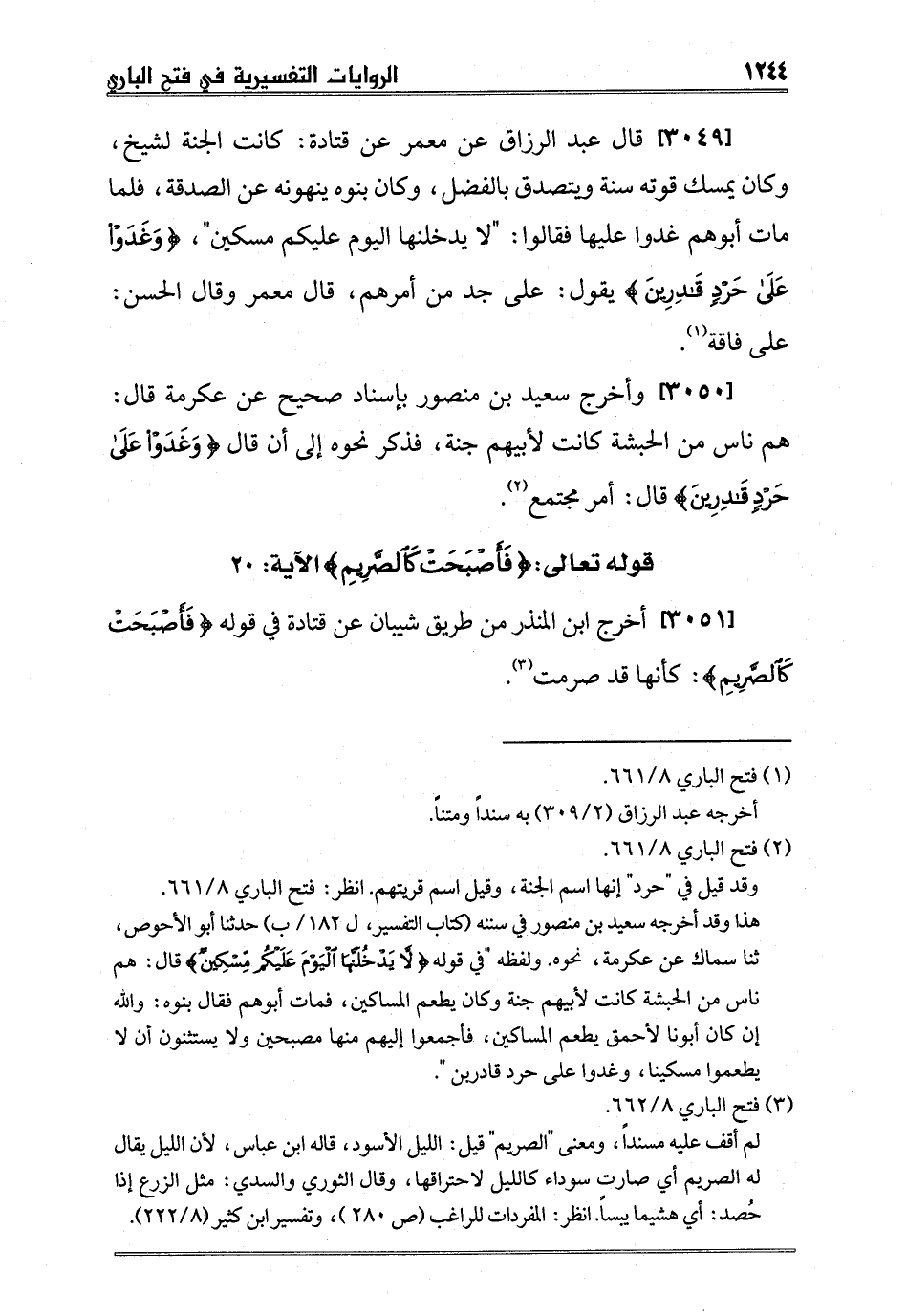 [3050] وأخرج سعيد بن منصور بإسناد صحيح عن عكرمة قال: هم ناس من الحبشة كانت لأبيهم جنة، فذكر نحوه إلى أن قال {وَغَدَوْا عَلَى حَرْدٍ قَادِرِينَ} قال: أمر مجتمع 2.