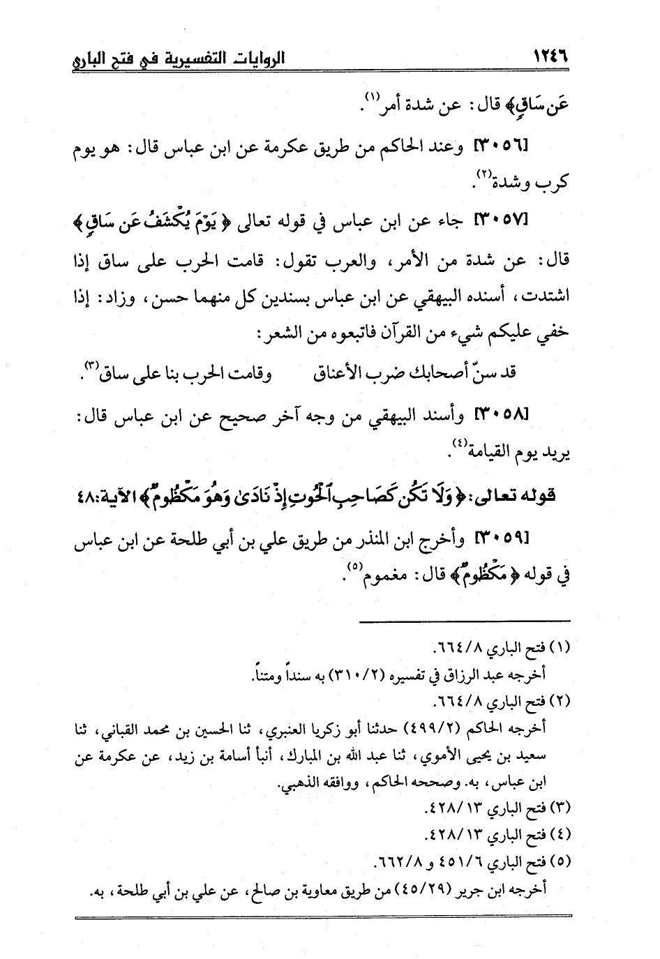 [3057] جاء عن ابن عباس في قوله تعالى {يَوْمَ يُكْشَفُ عَنْ سَاقٍ} قال: عن شدة من الأمر، والعرب تقول: قامت الحرب على ساق إذا اشتدت، أسنده البيهقي عن ابن عباس بسندين كل منهما حسن، وزاد: إذا خفي عليكم شيء من القرآن فاتبعوه من الشعر: