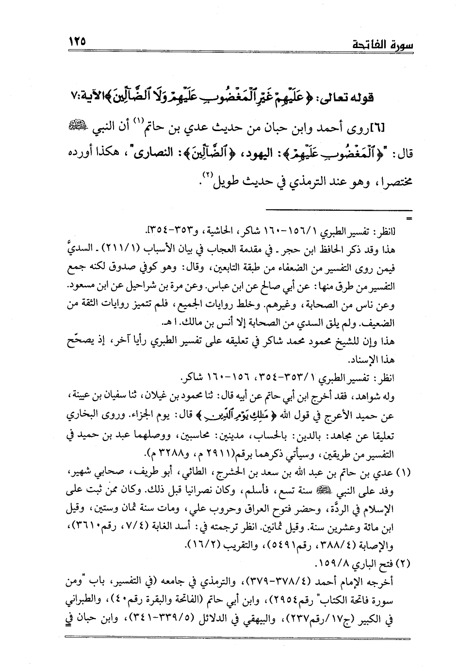 [6] روى أحمد وابن حبان من حديث عدي بن حاتم1 أن النبي صلى الله عليه وسلم قال: " {الْمَغْضُوبِ عَلَيْهِمْ} : اليهود، {الضَّالِّينَ} : النصارى"، هكذا أورده مختصرا، وهو عند الترمذي في حديث طويل2.