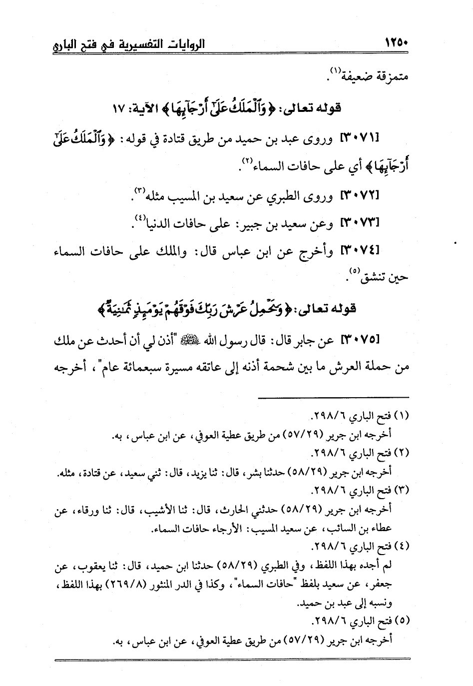 [3071] وروى عبد بن حميد من طريق قتادة في قوله: {وَالْمَلَكُ عَلَى أَرْجَائِهَا} أي على حافات السماء2.