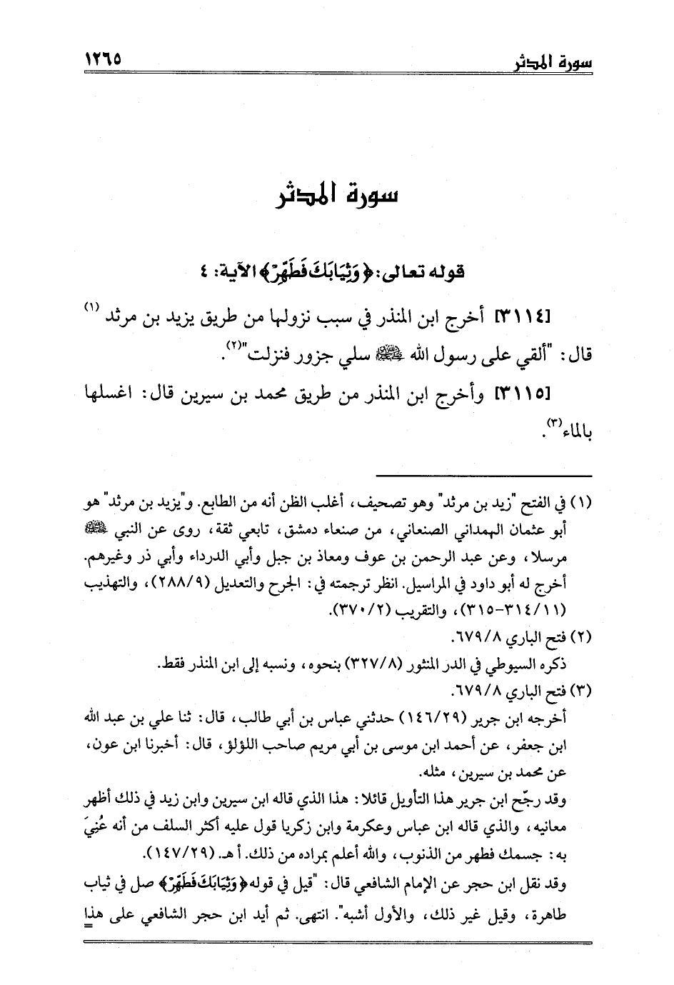 [3114] أخرج ابن المنذر في سبب نزولها من طريق يزيد بن مرثد1 قال: "ألقي على رسول الله صلى الله عليه وسلم سلي جزور فنزلت" 2.