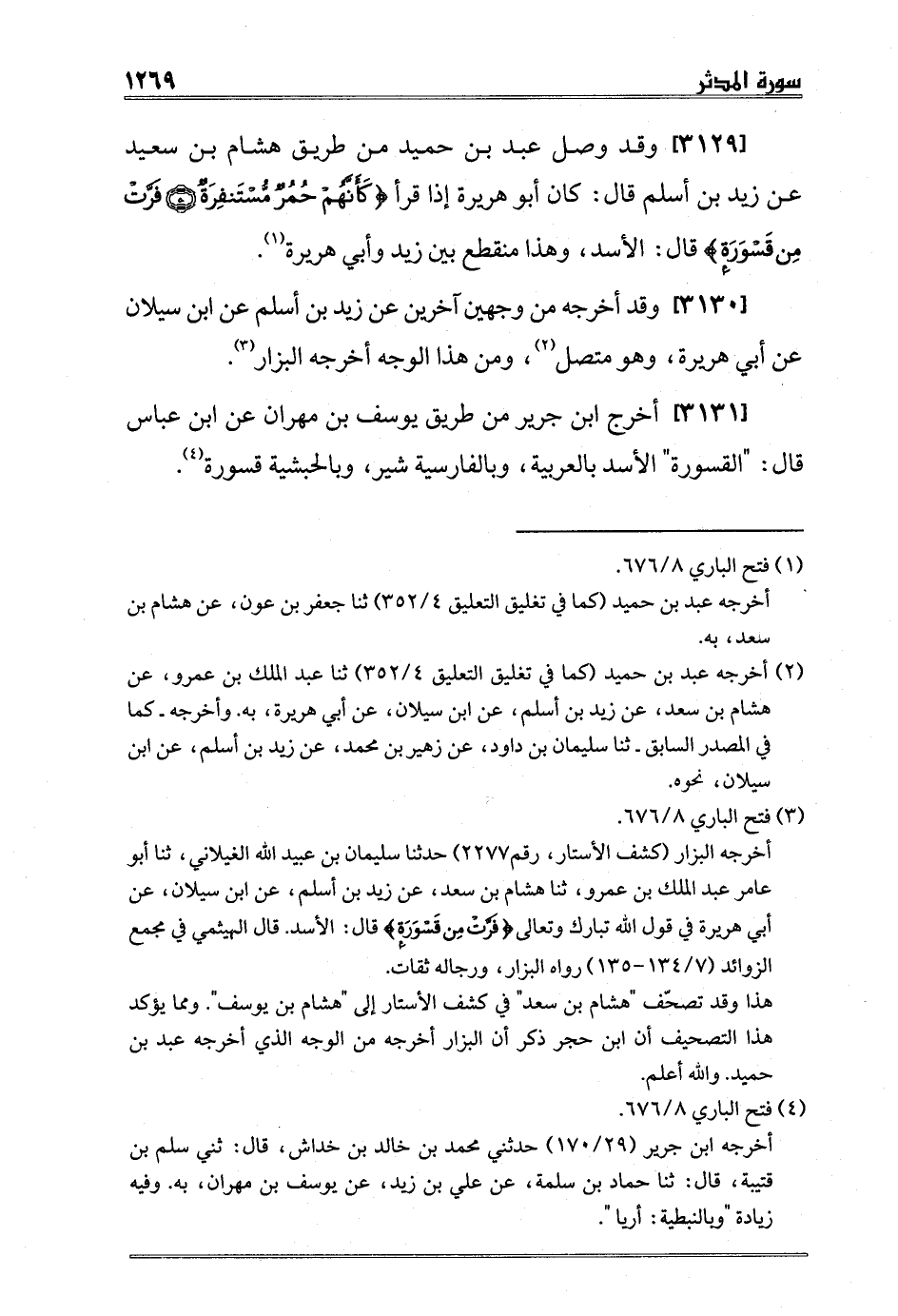 [3129] وقد وصل عبد بن حميد من طريق هشام بن سعيد عن زيد بن أسلم قال: كان أبو هريرة إذا قرأ {كَأَنَّهُمْ حُمُرٌ مُسْتَنْفِرَةٌ فَرَّتْ مِنْ قَسْوَرَةٍ} قال: الأسد، وهذا منقطع بين زيد وأبي هريرة1.