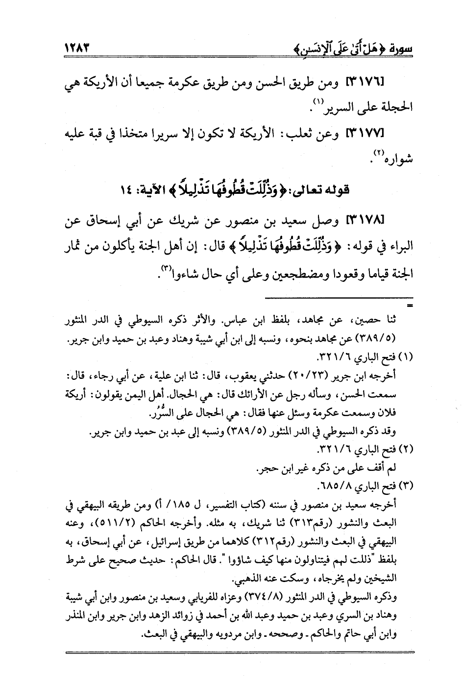 [3178] وصل سعيد بن منصور عن شريك عن أبي إسحاق عن البراء في قوله: {وَذُلِّلَتْ قُطُوفُهَا تَذْلِيلاً} قال: إن أهل الجنة يأكلون من ثمار الجنة قياما وقعودا ومضطجعين وعلى أي حال شاءوا3.