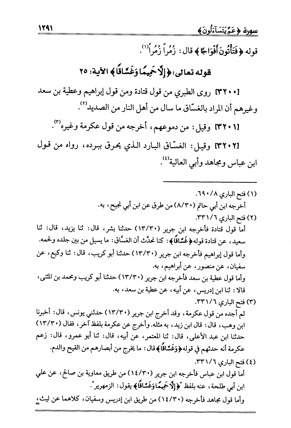 [3202] وقيل: الغسّاق البارد الذي يحرق ببرده، رواه من قول ابن عباس ومجاهد وأبي العالية4.