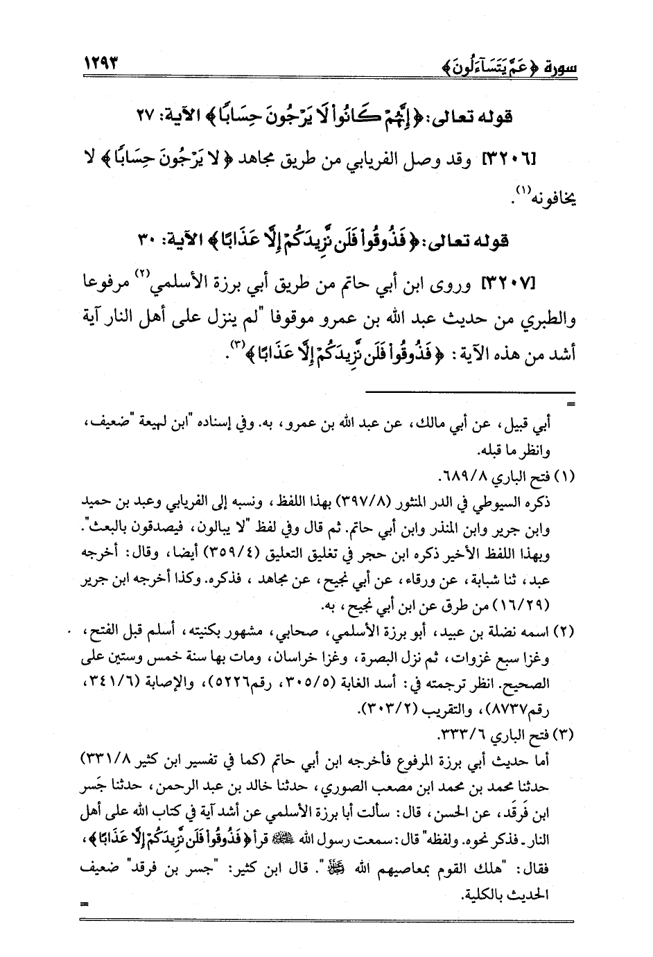 [3207] وروى ابن أبي حاتم من طريق أبي برزة الأسلمي2 مرفوعا والطبري من حديث عبد الله بن عمرو موقوفا "لم ينزل على أهل النار آية أشد من هذه الآية: {فَذُوقُوا فَلَنْ نَزِيدَكُمْ إِلَّا عَذَاباً} 3.