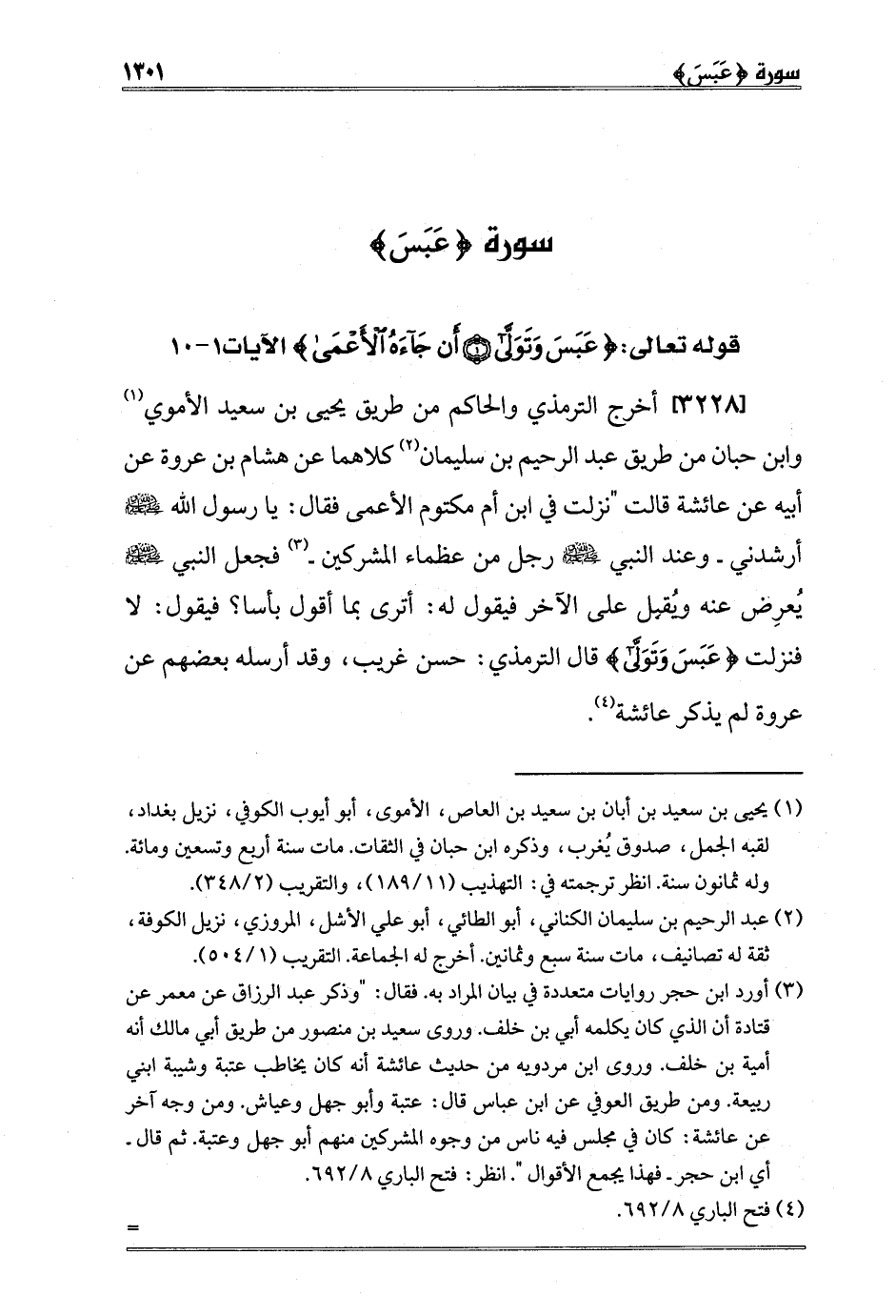 [3228] أخرج الترمذي والحاكم من طريق يحيى بن سعيد الأموي1 وابن حبان من طريق عبد الرحيم بن سليمان2 كلاهما عن هشام بن عروة عن أبيه عن عائشة قالت "نزلت في ابن أم مكتوم الأعمى فقال: يا رسول الله صلى الله عليه وسلم أرشدني - وعند النبي صلى الله عليه وسلم رجل من عظماء المشركين -3 فجعل النبي صلى الله عليه وسلم يُعرِض عنه ويُقبِل على الآخر فيقول له: "أترى بما أقول بأسا؟ " فيقول: لا فنزلت {عَبَسَ وَتَوَلَّى} قال الترمذي: حسن غريب، وقد أرسله بعضهم عن عروة لم يذكر عائشة4.
