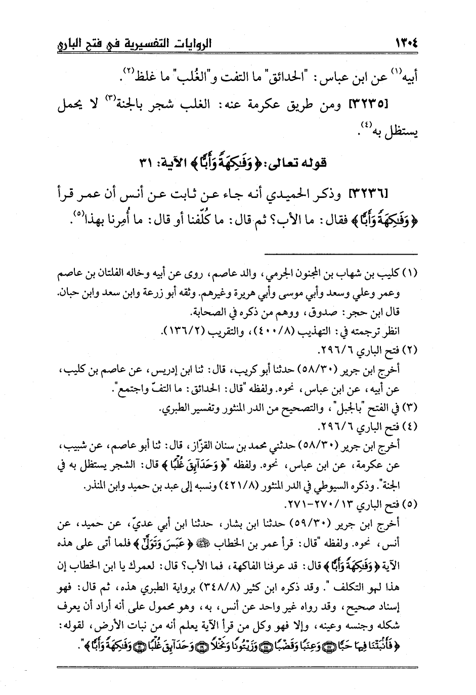 أخرج ابن جرير 30/59 حدثنا ابن بشار، حدثنا ابن أبي عديّ، عن حميد، عن أنس، نحوه. ولفظه "قال: قرأ عمر بن الخطاب رضي الله عنه {عَبَسَ وَتَوَلَّى} فلما أتى على هذه الآية {وَفَاكِهَةً وَأَبّاً} قال: قد عرفنا الفاكهة، فما الأب؟ قال: لعمرك يا ابن الخطاب إن هذا لهو التكلف ". وقد ذكره ابن كثير 8/348 برواية الطبري هذه، ثم قال: فهو إسناد صحيح، وقد رواه غير واحد عن أنس، به، وهو محمول على أنه أراد أن يعرف شكله وجنسه وعينه، وإلا فهو وكل من قرأ الآية يعلم أنه من نبات الأرض، لقوله: