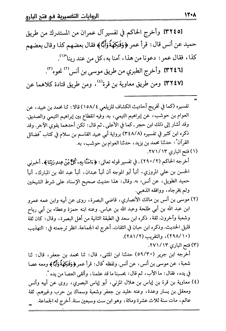 [3245] وأخرج الحاكم في تفسير آل عمران من المستدرك من طريق حميد عن أنس قال: قرأ عمر {وَفَاكِهَةً وَأَبّاً} فقال بعضهم كذا وقال بعضهم كذا، فقال عمر: دعونا من هذا، آمنا به، كل من عند ربنا"1.