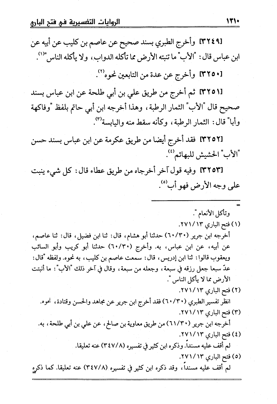 [3251] ثم أخرج من طريق علي بن أبي طلحة عن ابن عباس بسند صحيح قال "الأب" الثمار الرطبة، وهذا أخرجه ابن أبي حاتم بلفظ "وفاكهة وأبا" قال: الثمار الرطبة، وكأنه سقط منه واليابسة3.