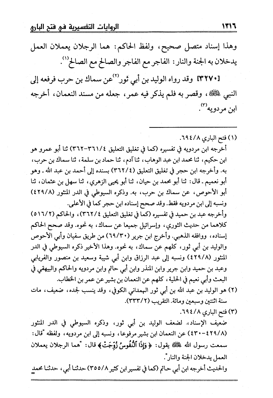 [3270] وقد رواه الوليد بن أبي ثور2 عن سماك بن حرب فرفعه إلى النبي صلى الله عليه وسلم، وقصر به فلم يذكر فيه عمر، جعله من مسند النعمان، أخرجه ابن مردويه3.