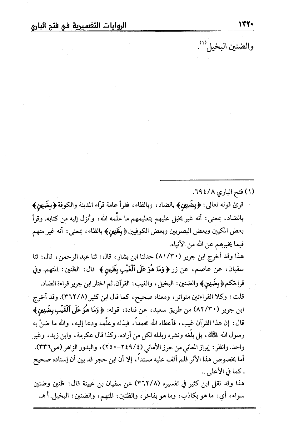 هذا وقد أخرج ابن جرير 30/81 حدثنا ابن بشار، قال: ثنا عبد الرحمن، قال: ثنا سفيان، عن عاصم، عن زر {وَمَا هُوَ عَلَى الْغَيْبِ بِظَنِينٍ} قال: الظنين: المتهم. وفي قراءتكم {بِضَنِينٍ} والضنين: البخيل، والغيب: القرآن. ثم اختار ابن جرير قراءة الضاد.