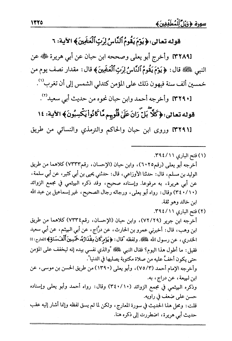 [3289] وأخرج أبو يعلى وصححه ابن حبان عن أبي هريرة رضي الله عنه عن النبي صلى الله عليه وسلم قال: {يَوْمَ يَقُومُ النَّاسُ لِرَبِّ الْعَالَمِينَ} قال: "مقدار نصف يوم من خمسين ألف سنة فيهون ذلك على المؤمن كتدلي الشمس إلى أن تغرب" 1.