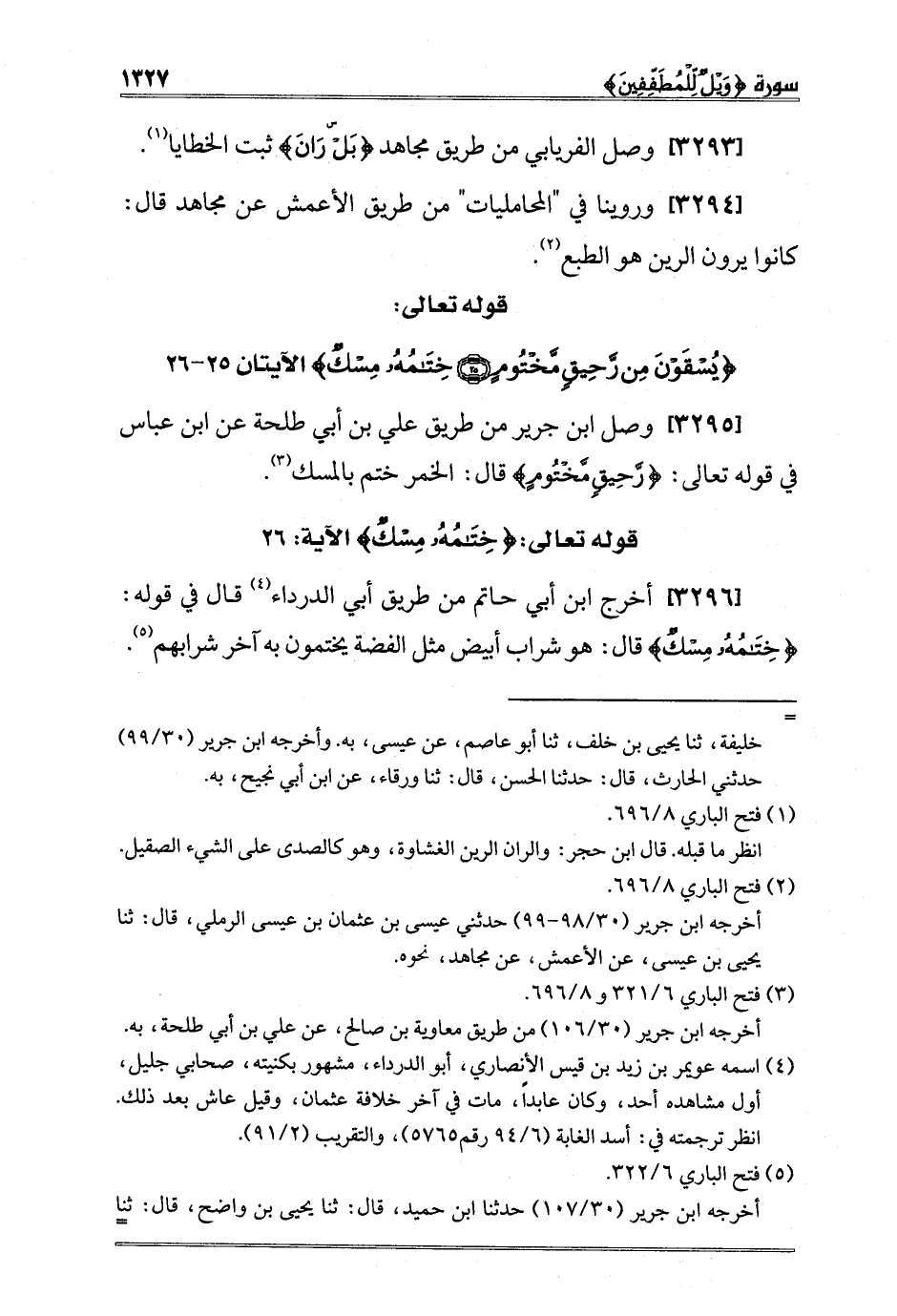[3296] أخرج ابن أبي حاتم من طريق أبي الدرداء4 قال في قوله: {خِتَامُهُ مِسْكٌ} قال: هو شراب أبيض مثل الفضة يختمون به آخر شرابهم5.