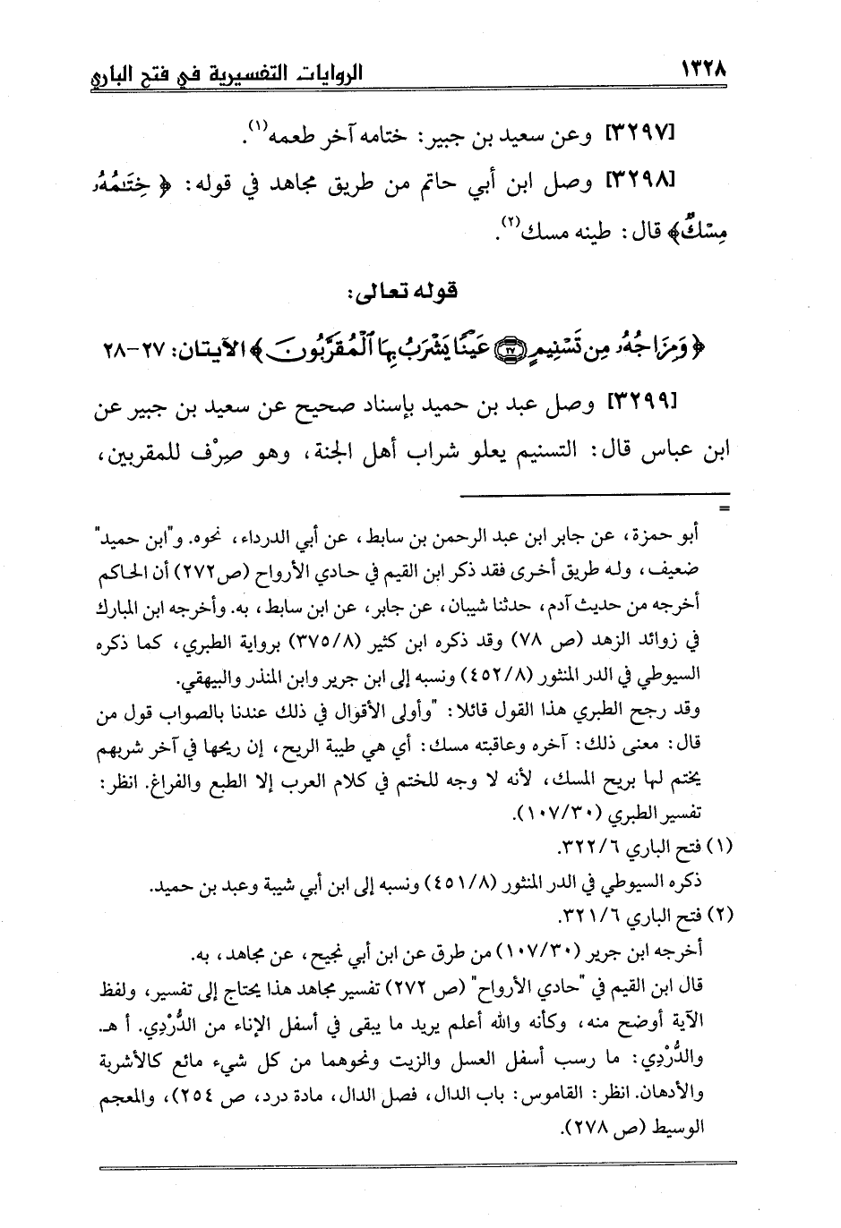 [3299] وصل عبد بن حميد بإسناد صحيح عن سعيد بن جبير عن ابن عباس قال: التسنيم يعلو شراب أهل الجنة، وهو صِرْف للمقربين،