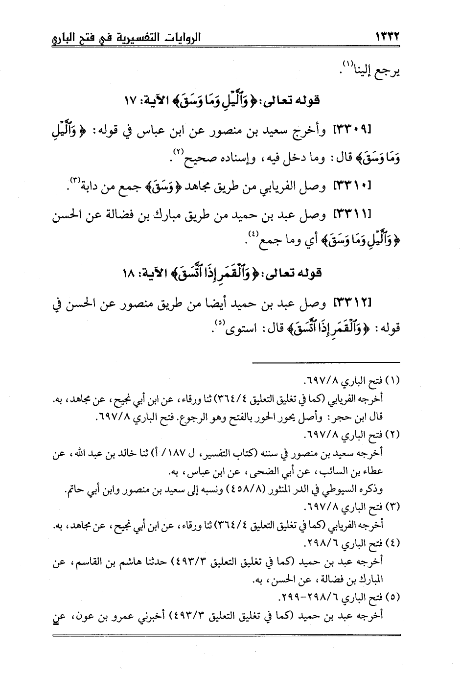 [3311] وصل عبد بن حميد من طريق مبارك بن فضالة عن الحسن {وَاللَّيْلِ وَمَا وَسَقَ} أي وما جمع4.