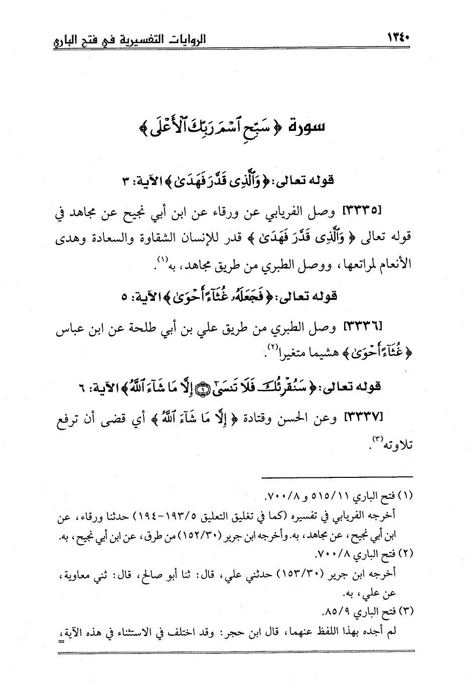 [3335] وصل الفريابي عن ورقاء عن ابن أبي نجيح عن مجاهد في قوله تعالى {وَالَّذِي قَدَّرَ فَهَدَى} قدر للإنسان الشقاوة والسعادة وهدى الأنعام لمراتعها، ووصل الطبري من طريق مجاهد، به1.