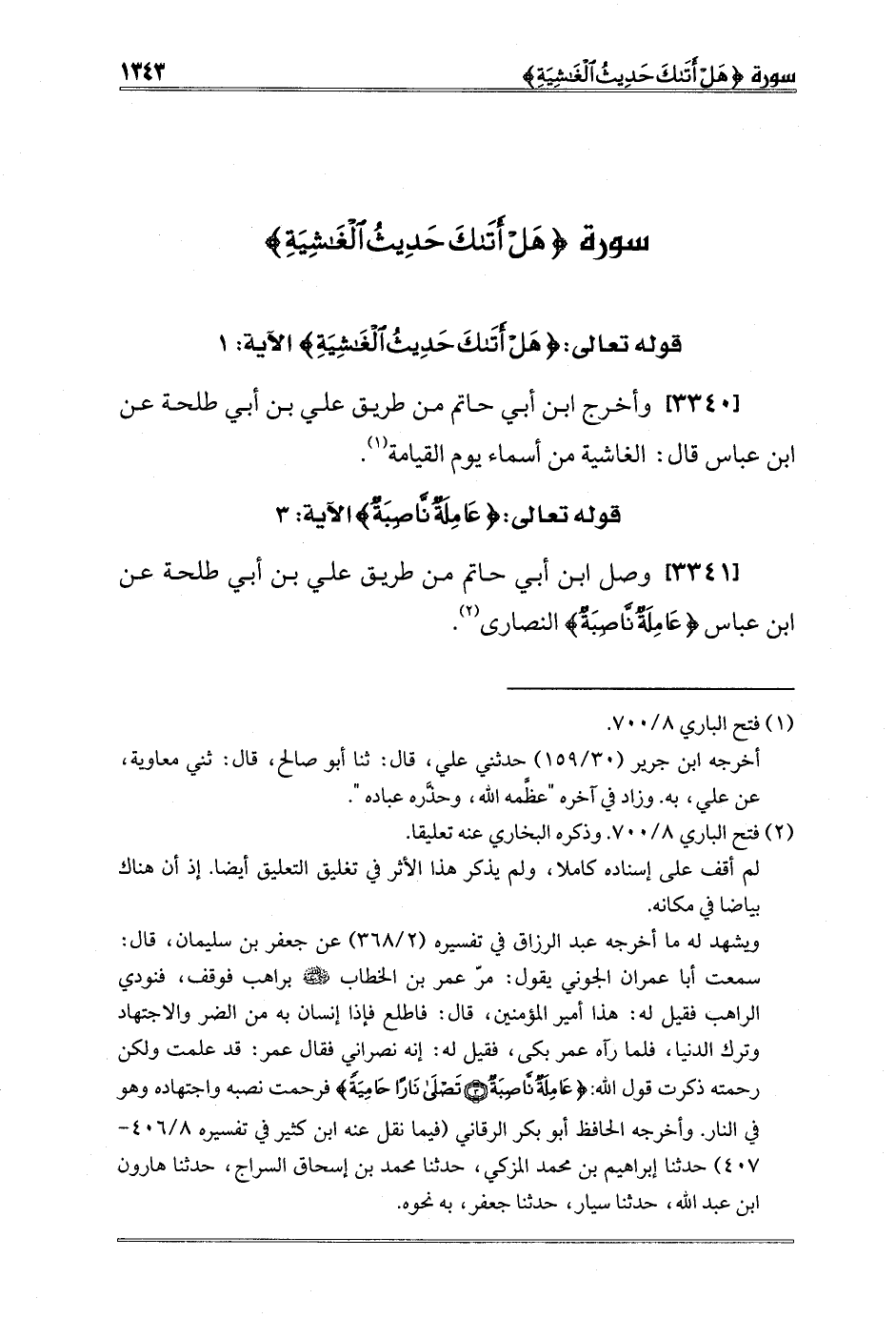 [3340] وأخرج ابن أبي حاتم من طريق علي بن أبي طلحة عن ابن عباس قال: الغاشية من أسماء يوم القيامة1.