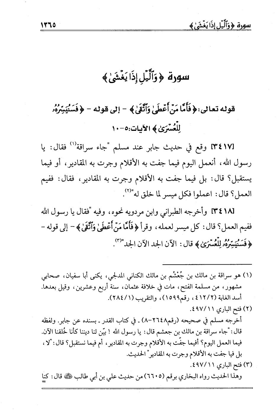 [3418] وأخرجه الطبراني وابن مردويه نحوه، وفيه "فقال يا رسول الله ففيم العمل؟ قال: "كل ميسر لعمله"، وقرأ {فَأَمَّا مَنْ أَعْطَى وَاتَّقَى} - إلى قوله - {فَسَنُيَسِّرُهُ لِلْعُسْرَى} قال: الآن الجد الآن الجد" 3.