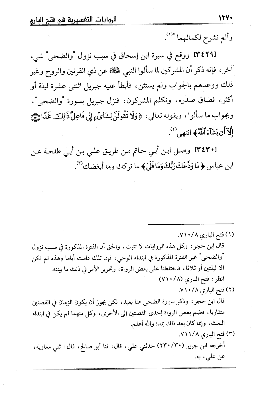 [3429] ووقع في سيرة ابن إسحاق في سبب نزول "والضحى" شيء آخر، فإنه ذكر أن المشركين لما سألوا النبي صلى الله عليه وسلم عن ذي القرنين والروح وغير ذلك ووعدهم بالجواب ولم يستثن، فأبطأ عليه جبريل اثنتى عشرة ليلة أو أكثر، فضاق صدره، وتكلم المشركون: فنزل جبريل بسورة "والضحى"، وبجواب ما سألوا، وبقوله تعالى: {وَلا تَقُولَنَّ لِشَيْءٍ إِنِّي فَاعِلٌ ذَلِكَ غَداً} انتهى2.