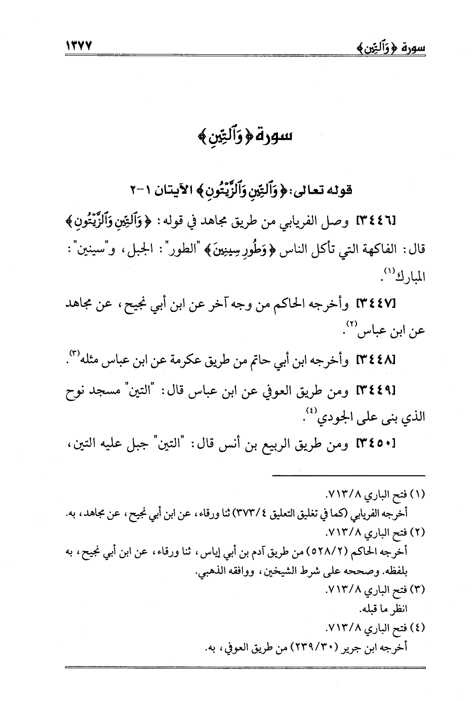 [3446] وصل الفريابي من طريق مجاهد في قوله: {وَالتِّينِ وَالزَّيْتُونِ} قال: الفاكهة التي تأكل الناس {وَطُورِ سِينِينَ} "الطور": الجبل، و"سينين": المبارك 1.