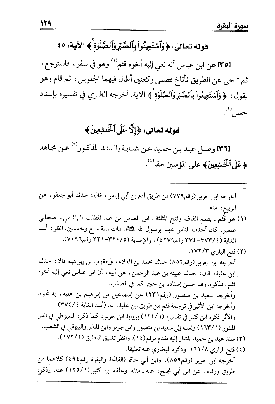 [35] عن ابن عباس أنه نعي إليه أخوه قثم1 وهو في سفر، فاسترجع، ثم تنحى عن الطريق فأناخ فصلى ركعتين أطال فيهما الجلوس، ثم قام وهو يقول: {وَاسْتَعِينُوا بِالصَّبْرِ وَالصَّلاةِ} الآية. أخرجه الطبري في تفسيره بإسناد حسن2.