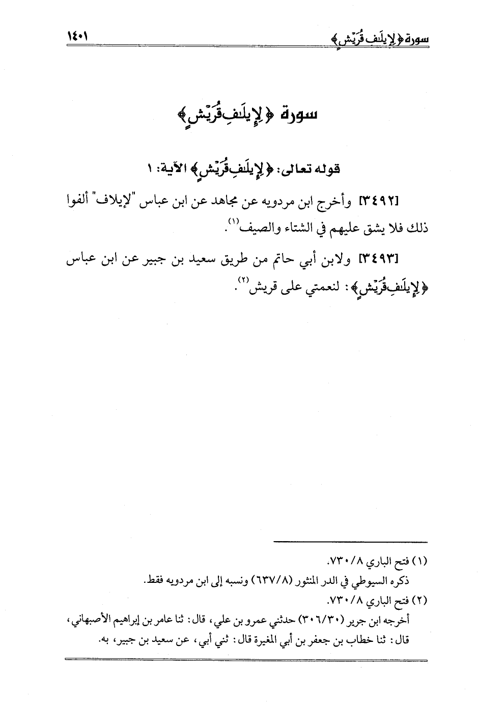 [3493] ولابن أبي حاتم من طريق سعيد بن جبير عن ابن عباس {لِإِيلافِ قُرَيْشٍ} : لنعمتي على قريش2.