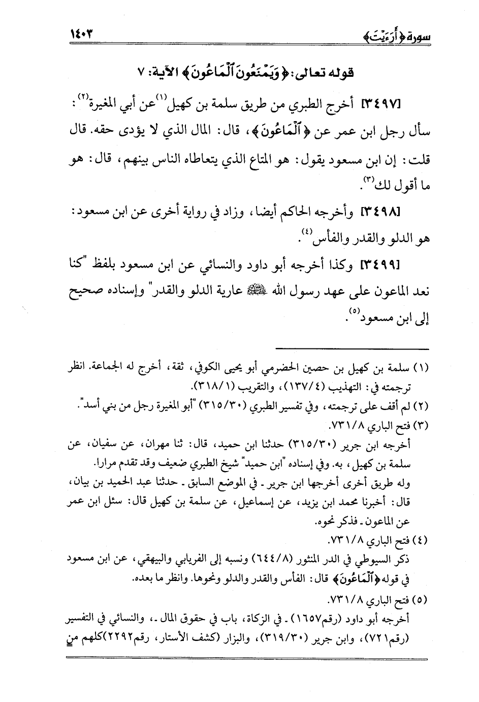 [3499] وكذا أخرجه أبو داود والنسائي عن ابن مسعود بلفظ "كنا نعد الماعون على عهد رسول الله صلى الله عليه وسلم عارية الدلو والقدر" وإسناده صحيح إلى ابن مسعود5.