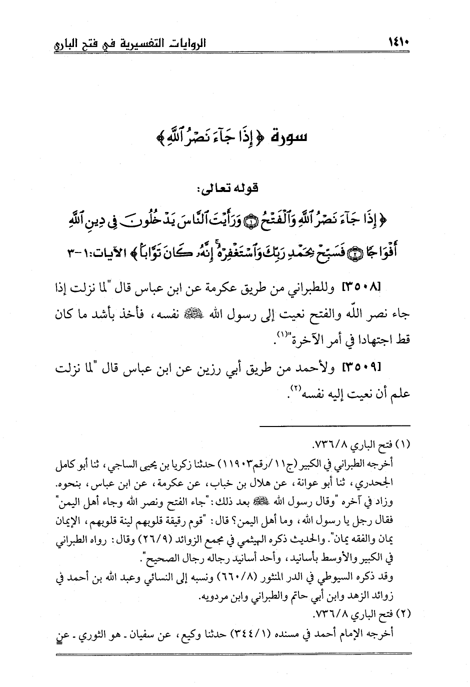 [3509] ولأحمد من طريق أبي رزين عن ابن عباس قال "لما نزلت علم أن نعيت إليه نفسه2.