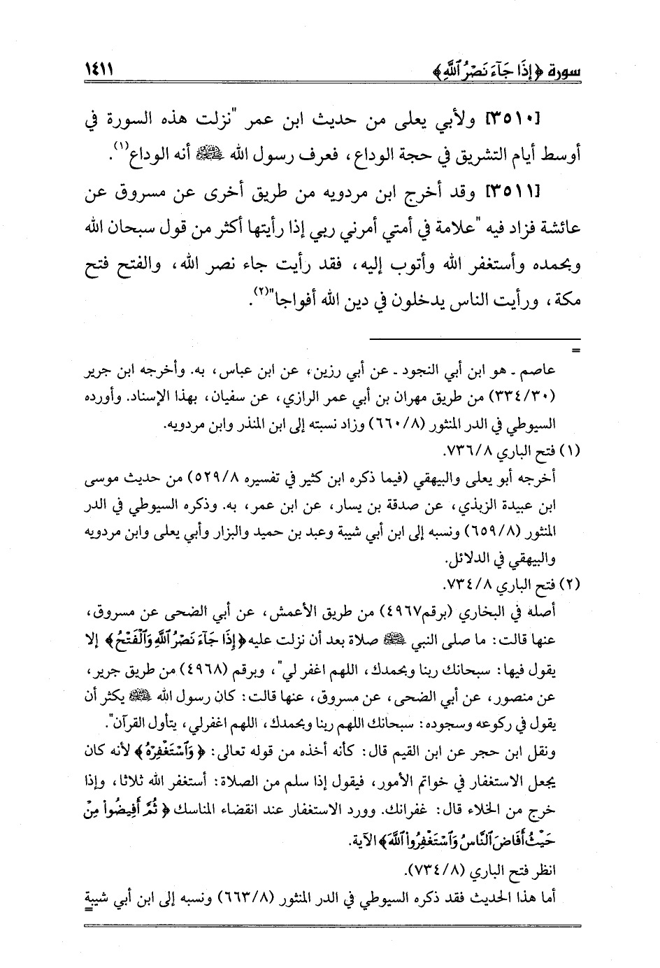 [3511] وقد أخرج ابن مردويه من طريق أخرى عن مسروق عن عائشة فزاد فيه "علامة في أمتي أمرني ربي إذا رأيتها أكثر من قول سبحان الله وبحمده وأستغفر الله وأتوب إليه، فقد رأيت جاء نصر الله، والفتح فتح مكة، ورأيت الناس يدخلون في دين الله أفواجا" 2.