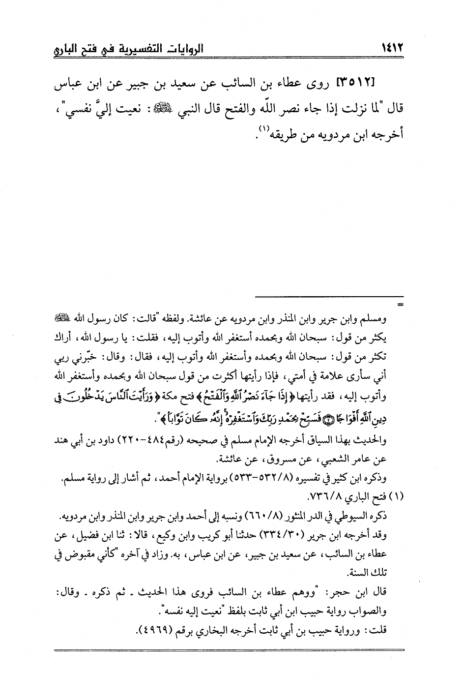 [3512] روى عطاء بن السائب عن سعيد بن جبير عن ابن عباس قال "لما نزلت إذا جاء نصر الله والفتح قال النبي صلى الله عليه وسلم: "نعيت إليَّ نفسي"، أخرجه ابن مردويه من طريقه1.