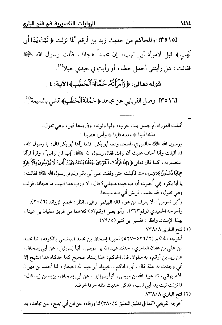 [3515] وللحاكم من حديث زيد بن أرقم "لما نزلت {تَبَّتْ يَدَا أَبِي لَهَبٍ} قيل لامرأة أبي لهب: إن محمداً هجاك، فأتت رسول الله صلى الله عليه وسلم فقالت: هل رأيتني أحمل حطبا، أو رأيت في جيدي حبلا1.