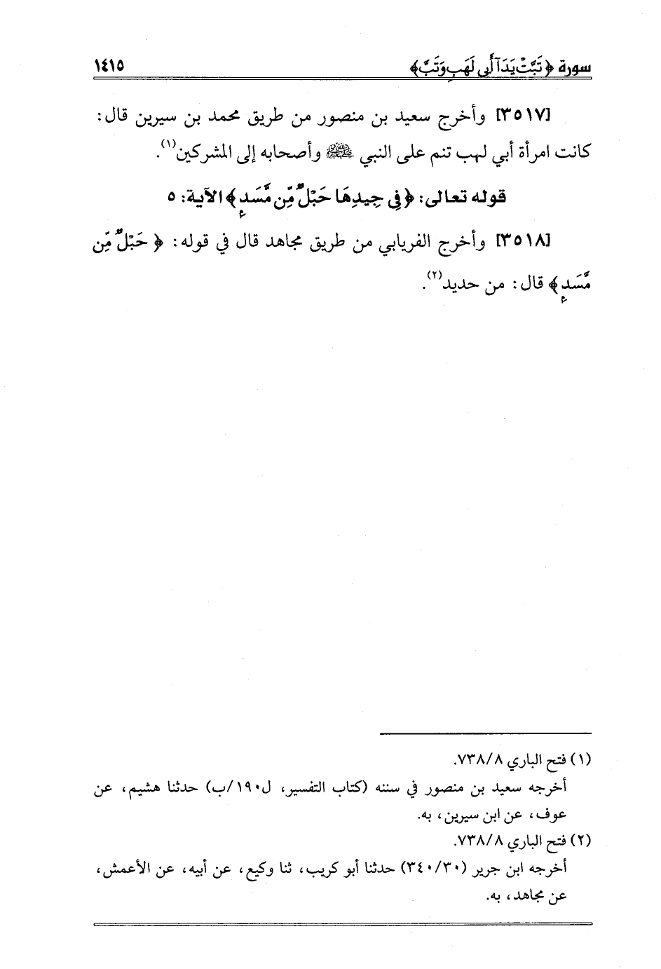[3518] وأخرج الفريابي من طريق مجاهد قال في قوله: {حَبْلٌ مِنْ مَسَدٍ} قال: من حديد2.