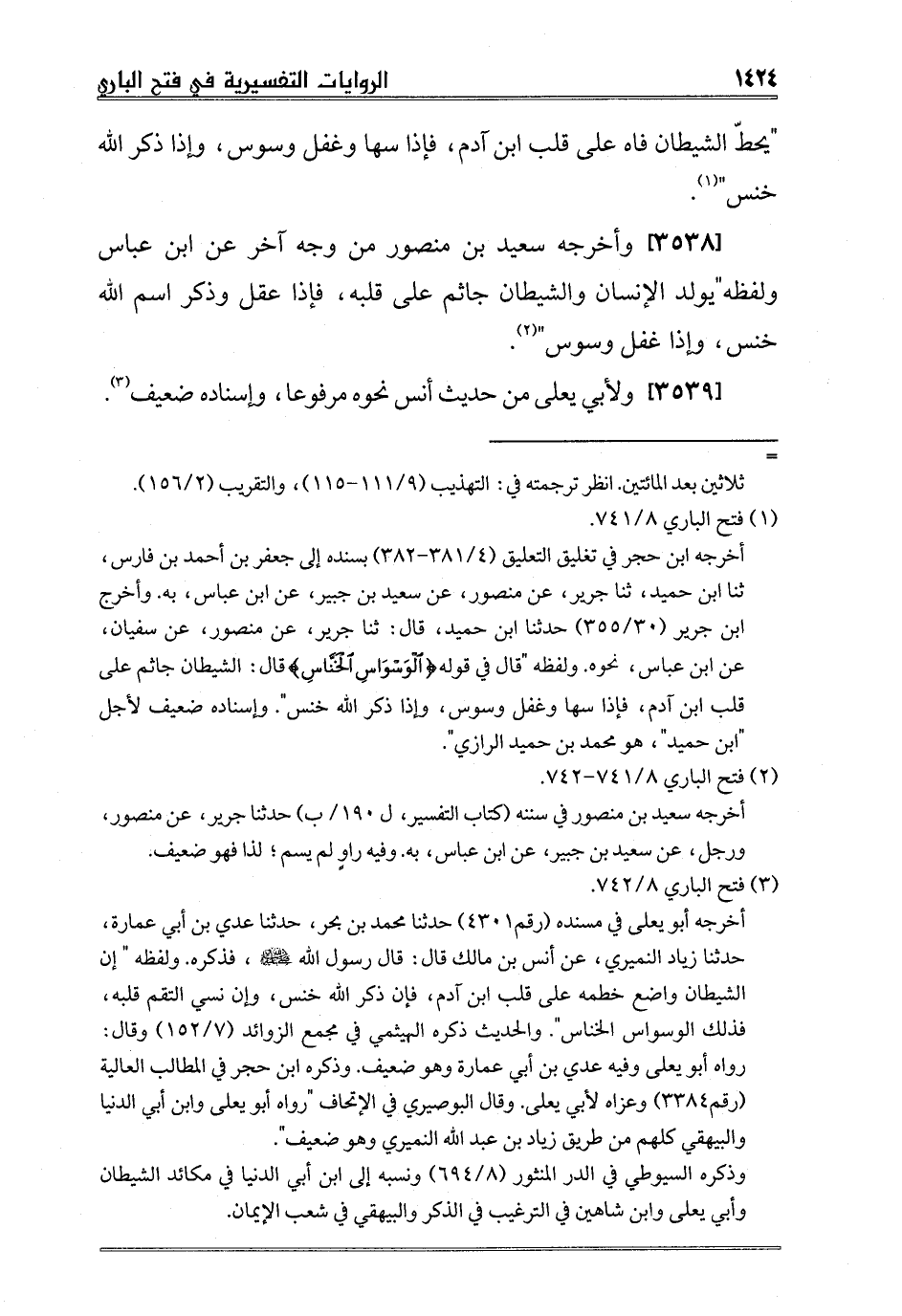 [3538] وأخرجه سعيد بن منصور من وجه آخر عن ابن عباس ولفظه"يولد الإنسان والشيطان جاثم على قلبه، فإذا عقل وذكر اسم الله خنس، وإذا غفل وسوس"2.