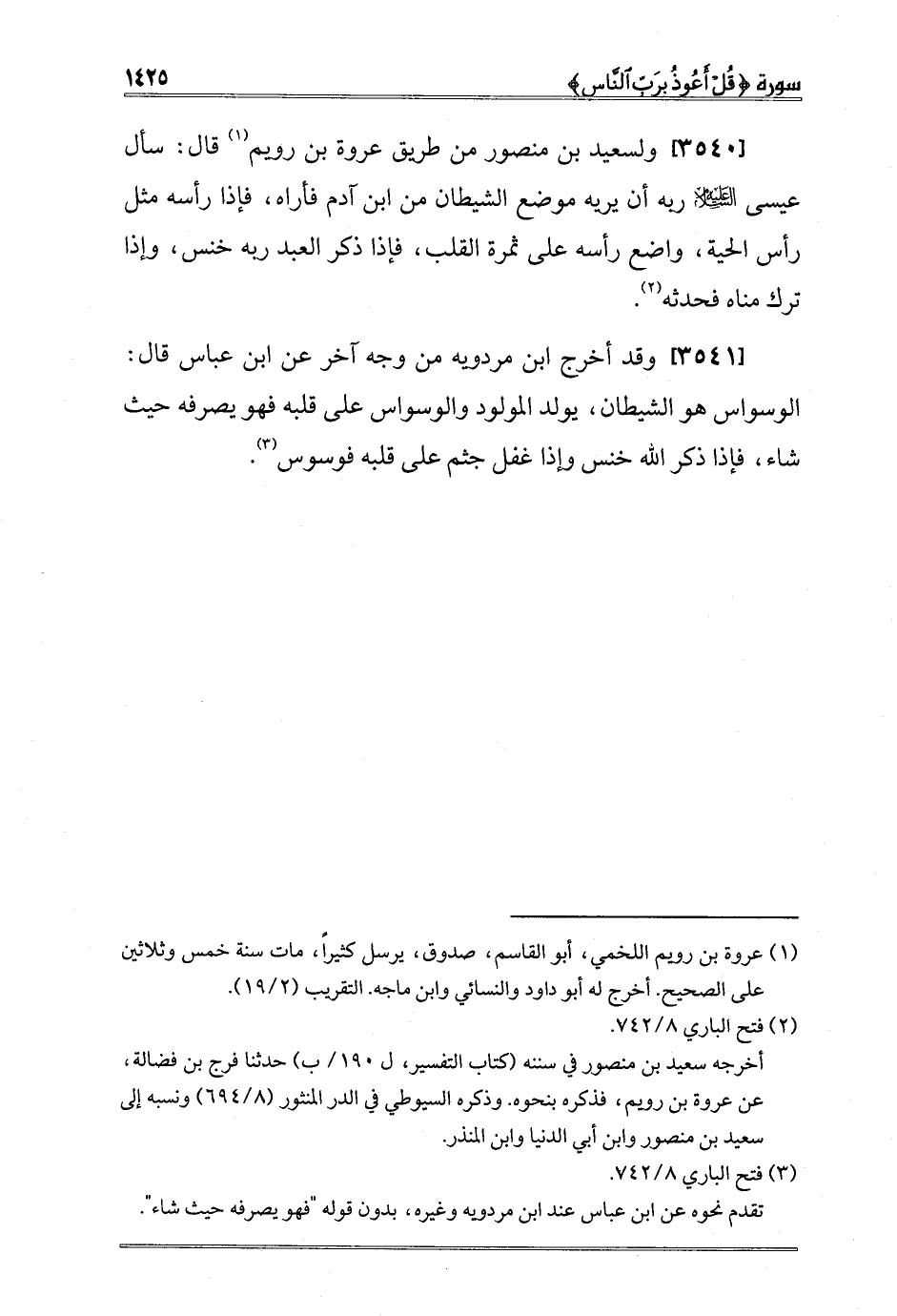 [3540] ولسعيد بن منصور من طريق عروة بن رويم1 قال: سأل عيسى عليه السلام ربه أن يريه موضع الشيطان من ابن آدم فأراه، فإذا رأسه مثل رأس الحية، واضع رأسه على ثمرة القلب، فإذا ذكر العبد ربه خنس، وإذا ترك مناه فحدثه2.