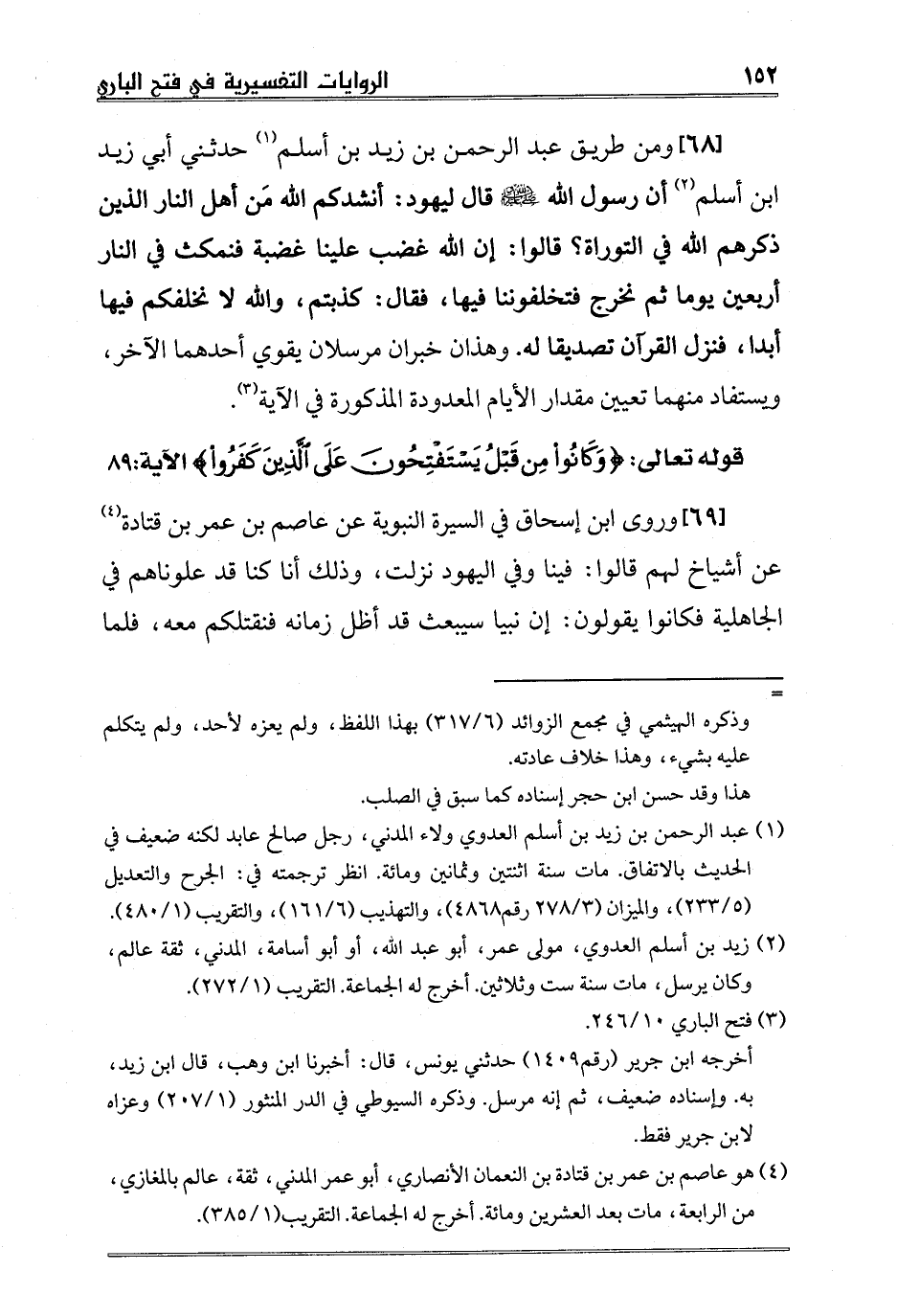 [68] ومن طريق عبد الرحمن بن زيد بن أسلم1 حدثني أبي زيد ابن أسلم2 أن رسول الله صلى الله عليه وسلم قال ليهود: "أنشدكم الله مَن أهل النار الذين ذكرهم الله في التوراة؟ " قالوا: إن الله غضب علينا غضبة فنمكث في النار أربعين يوما ثم نخرج فتخلفوننا فيها، فقال: "كذبتم، والله لا نخلفكم فيها أبدا"، فنزل القرآن تصديقا له. وهذان خبران مرسلان يقوي أحدهما الآخر، ويستفاد منهما تعيين مقدار الأيام المعدودة المذكورة في الآية3.