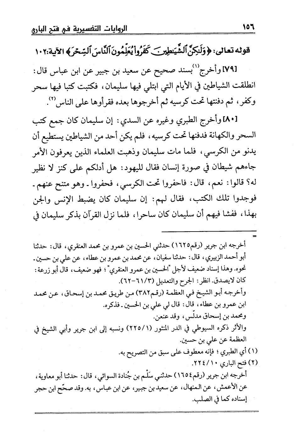 [79] وأخرج1 بسند صحيح عن سعيد بن جبير عن ابن عباس قال: انطلقت الشياطين في الأيام التي ابتلي فيها سليمان، فكتبت كتبا فيها سحر وكفر، ثم دفنتها تحت كرسيه ثم أخرجوها بعده فقرأوها على الناس2.