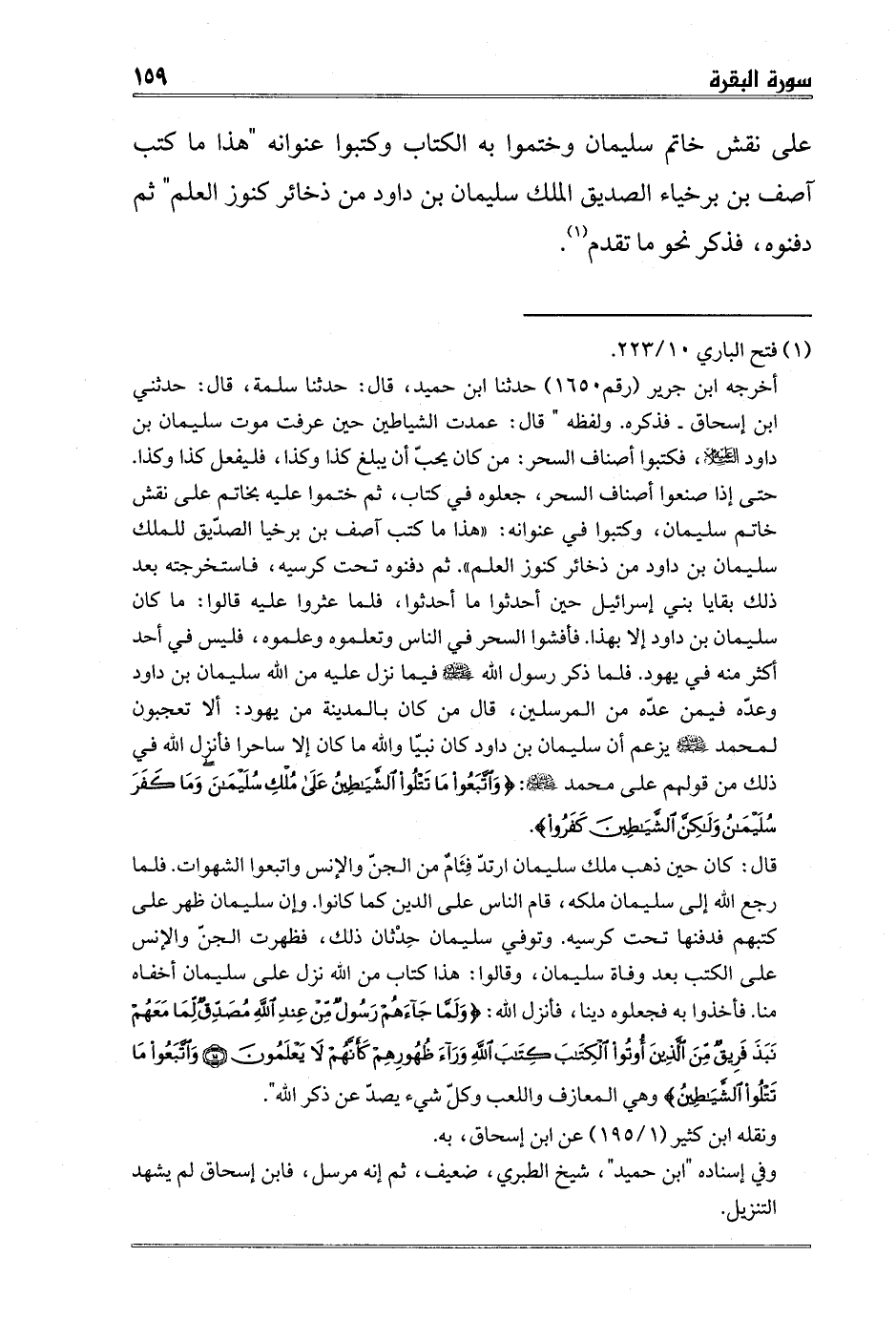 أخرجه ابن جرير رقم1650 حدثنا ابن حميد، قال: حدثنا سلمة، قال: حدثني ابن إسحاق - فذكره. ولفظه " قال: عمدت الشياطين حين عرفت موت سليمان بن داود عليه السلام، فكتبوا أصناف السحر: من كان يحبّ أن يبلغ كذا وكذا، فليفعل كذا وكذا. حتى إذا صنعوا أصناف السحر، جعلوه في كتاب، ثم ختموا عليه بخاتم على نقش خاتم سليمان، وكتبوا في عنوانه: "هذا ما كتب آصف بن برخيا الصدّيق للملك سليمان بن داود من ذخائر كنوز العلم". ثم دفنوه تحت كرسيه، فاستخرجته بعد ذلك بقايا بني إسرائيل حين أحدثوا ما أحدثوا، فلما عثروا عليه قالوا: ما كان سليمان بن داود إلا بهذا. فأفشوا السحر في الناس وتعلموه وعلموه، فليس في أحد أكثر منه في يهود. فلما ذكر رسول الله صلى الله عليه وسلم فيما نزل عليه من الله سليمان بن داود وعدّه فيمن عدّه من المرسلين، قال من كان بالمدينة من يهود: ألا تعجبون لمحمد صلى الله عليه وسلم يزعم أن سليمان بن داود كان نبيّا والله ما كان إلا ساحرا فأنزل الله في ذلك من قولهم على محمد صلى الله عليه وسلم: {وَاتَّبَعُوا مَا تَتْلُوا الشَّيَاطِينُ عَلَى مُلْكِ سُلَيْمَانَ وَمَا كَفَرَ سُلَيْمَانُ وَلَكِنَّ الشَّيَاطِينَ كَفَرُوا} .
