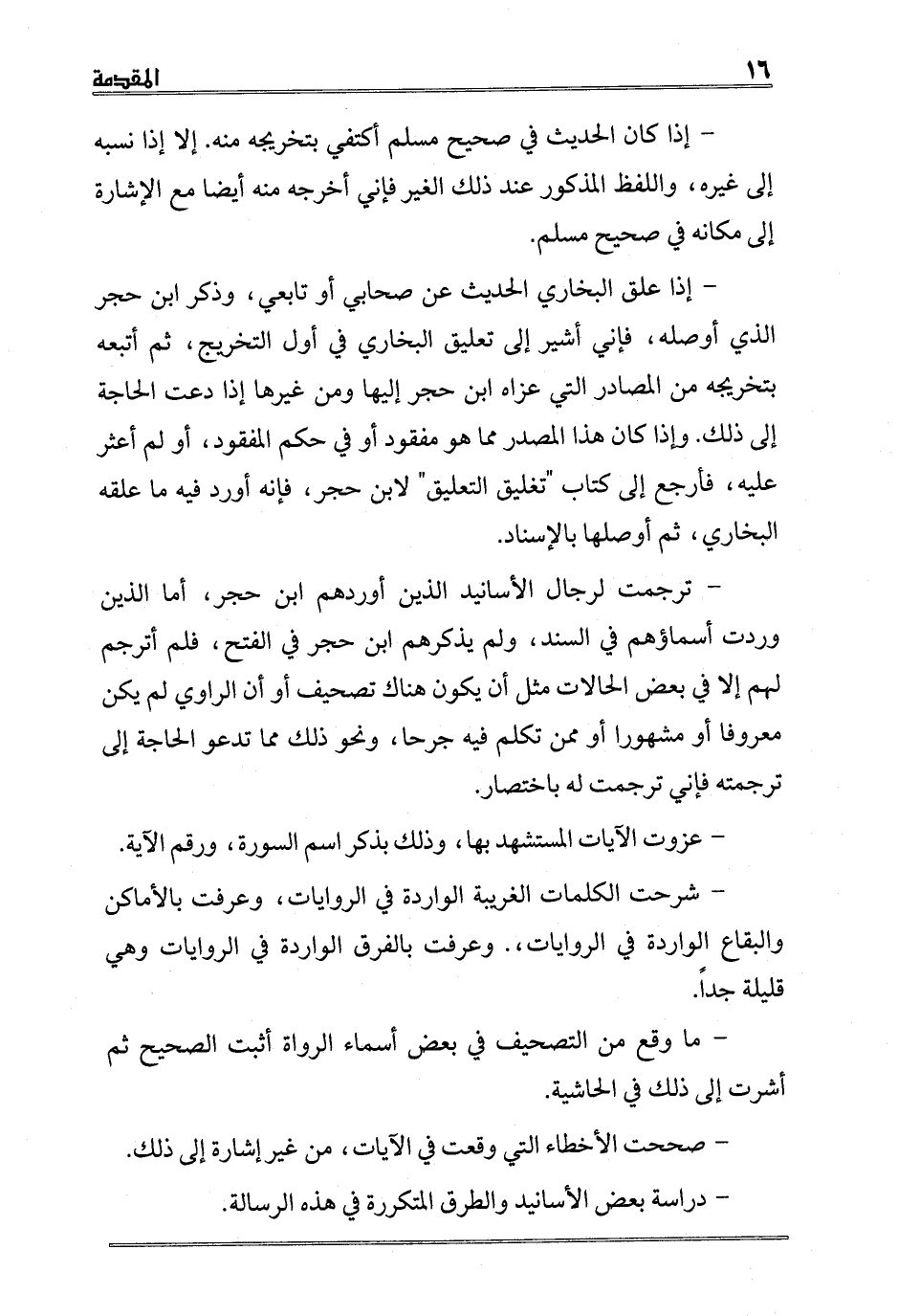 - ترجمت لرجال الأسانيد الذين أوردهم ابن حجر، أما الذين وردت أسماؤهم في السند، ولم يذكرهم ابن حجر في الفتح، فلم أترجم لهم إلا في بعض الحالات مثل أن يكون هناك تصحيف أو أن الراوي لم يكن معروفا أو مشهورا أو ممن تكلم فيه جرحا، ونحو ذلك مما تدعو الحاجة إلى ترجمته فإني ترجمت له باختصار.