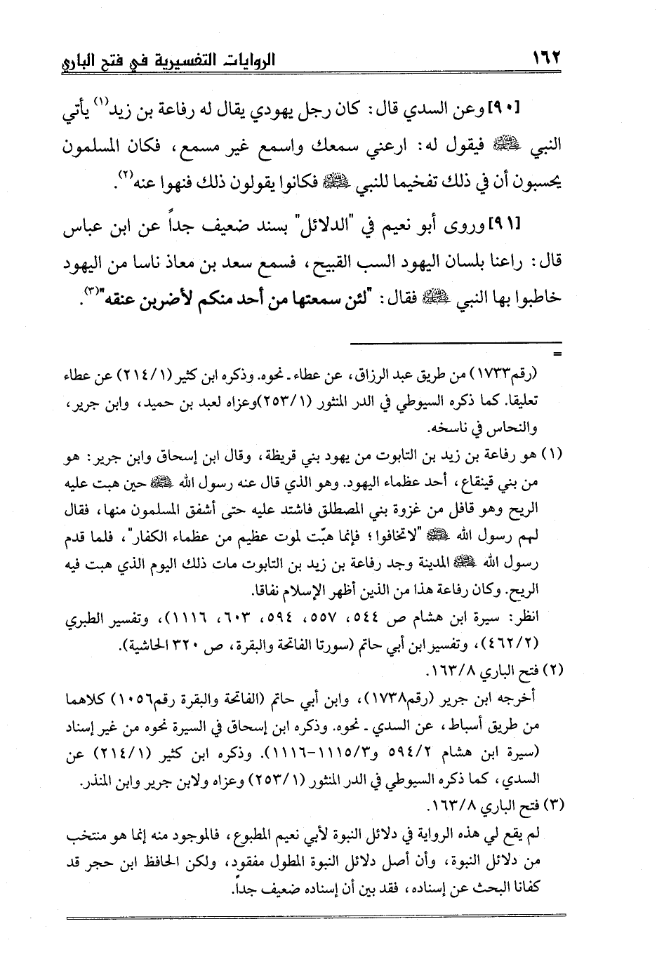 [91] وروى أبو نعيم في "الدلائل" بسند ضعيف جداً عن ابن عباس قال: راعنا بلسان اليهود السب القبيح، فسمع سعد بن معاذ ناسا من اليهود خاطبوا بها النبي صلى الله عليه وسلم فقال: "لئن سمعتها من أحد منكم لأضربن عنقه"3.