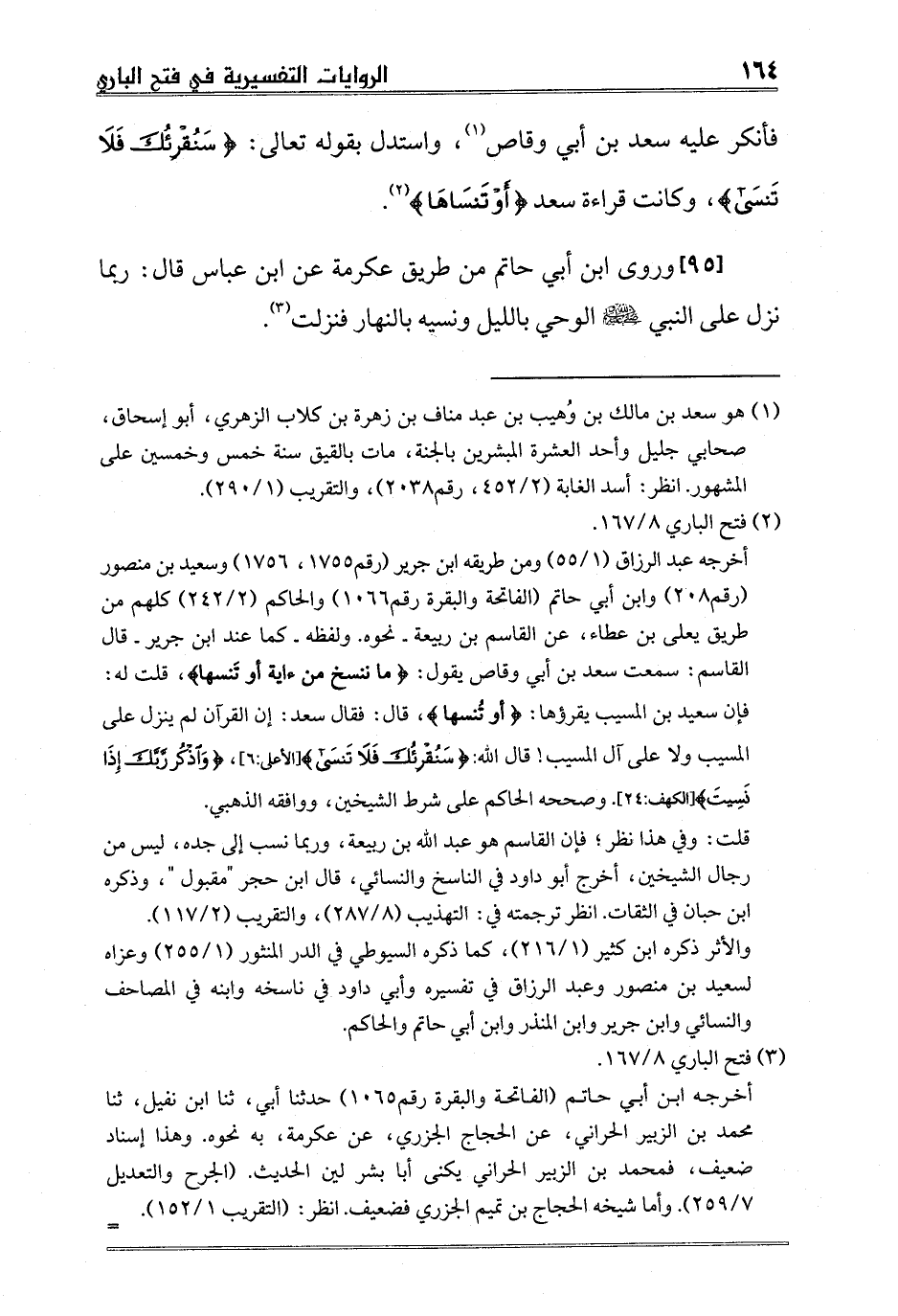 أخرجه عبد الرزاق 1/55 ومن طريقه ابن جرير رقم1755، 1756 وسعيد بن منصور رقم208 وابن أبي حاتم الفاتحة والبقرة رقم1066 والحاكم 2/242 كلهم من طريق يعلى بن عطاء، عن القاسم بن ربيعة - نحوه. ولفظه - كما عند ابن جرير - قال القاسم: سمعت سعد بن أبي وقاص يقول: {ما ننسخ من ءاية أو تَنْسَهَا} ، قلت له: فإن سعيد بن المسيب يقرؤها: {أو تُنسها} ، قال: فقال سعد: إن القرآن لم ينزل على المسيب ولا على آل المسيب! قال الله: {سَنُقْرِئُكَ فَلا تَنْسَى} [الأعلى:6] ، {وَاذْكُرْ رَبَّكَ إِذَا نَسِيتَ} [الكهف:24] . وصححه الحاكم على شرط الشيخين، ووافقه الذهبي.