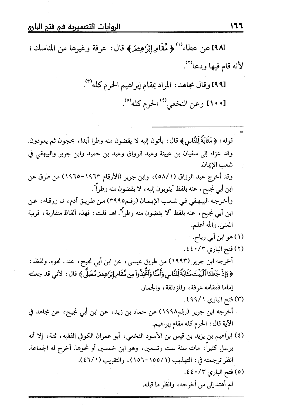 [98] عن عطاء 1 {مَقَامِ إِبْرَاهِيمَ} قال: عرفة وغيرها من المناسك؛ لأنه قام فيها ودعا2.