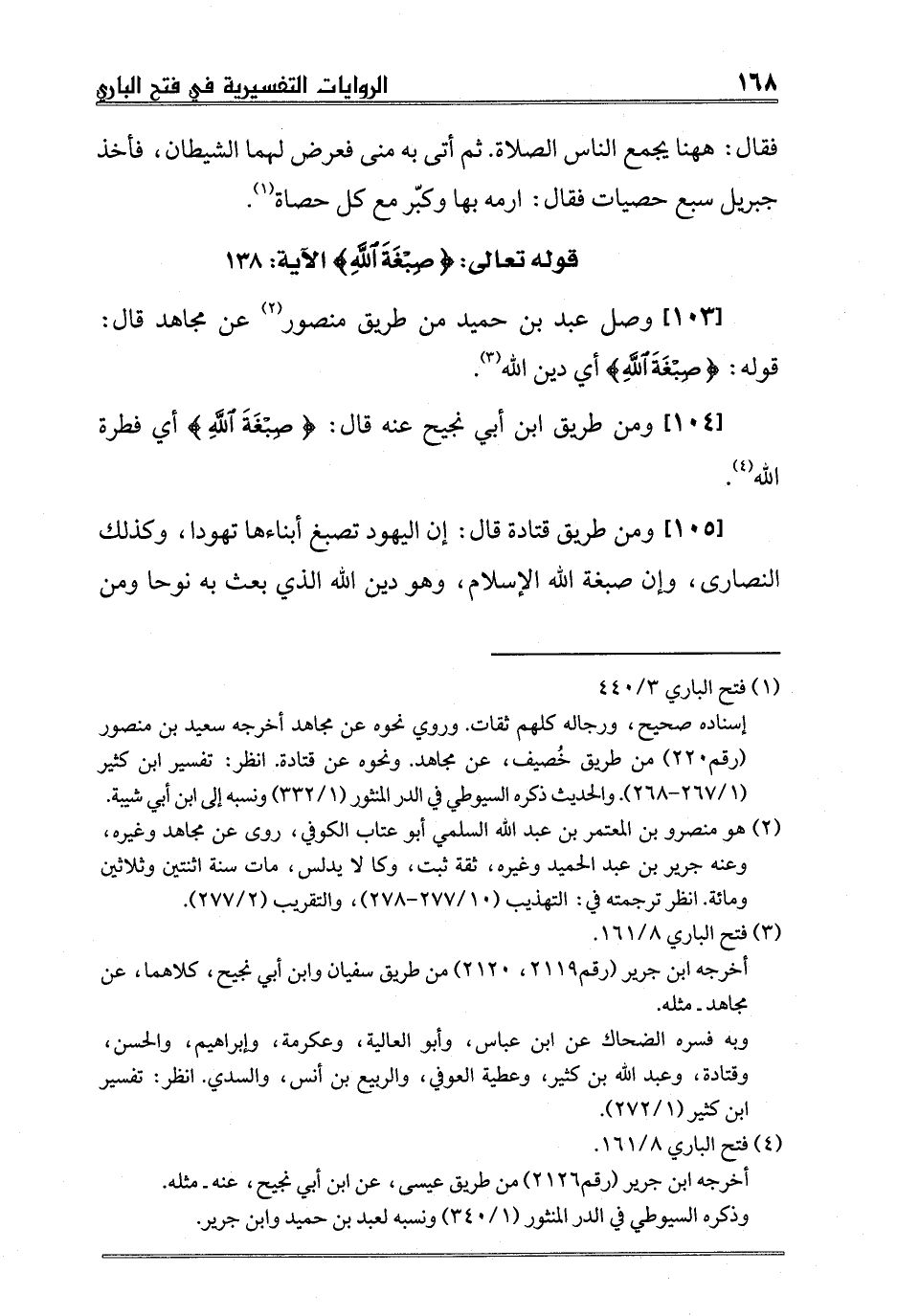 [103] وصل عبد بن حميد من طريق منصور2 عن مجاهد قال: قوله: {صِبْغَةَ اللَّهِ} أي دين الله3.