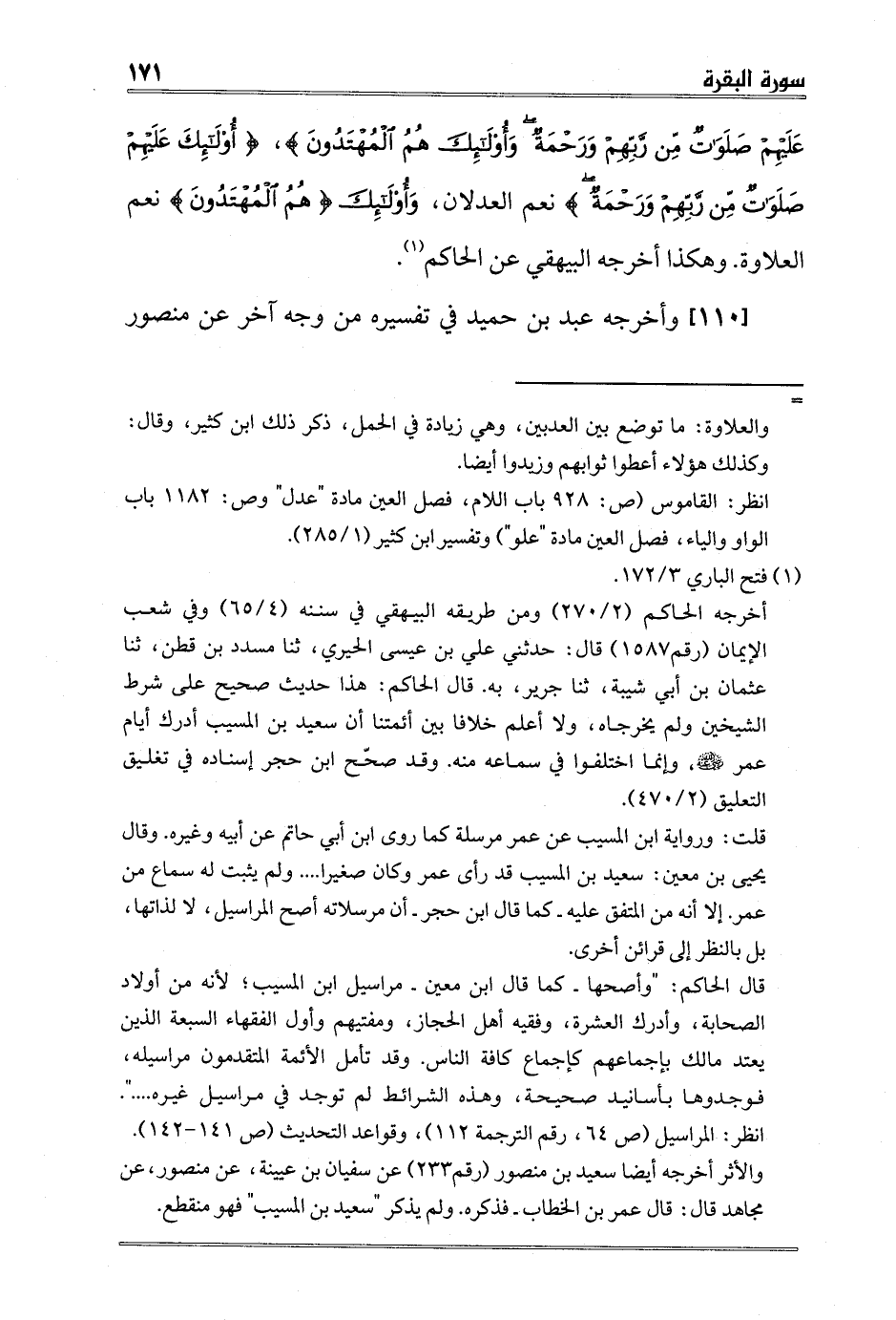عَلَيْهِمْ صَلَوَاتٌ مِنْ رَبِّهِمْ وَرَحْمَةٌ وَأُولَئِكَ هُمُ الْمُهْتَدُونَ} ، {أُولَئِكَ عَلَيْهِمْ صَلَوَاتٌ مِنْ رَبِّهِمْ وَرَحْمَةٌ} نعم العدلان، {وَأُولَئِكَ هُمُ الْمُهْتَدُونَ} نعم العلاوة. وهكذا أخرجه البيهقي عن الحاكم1.