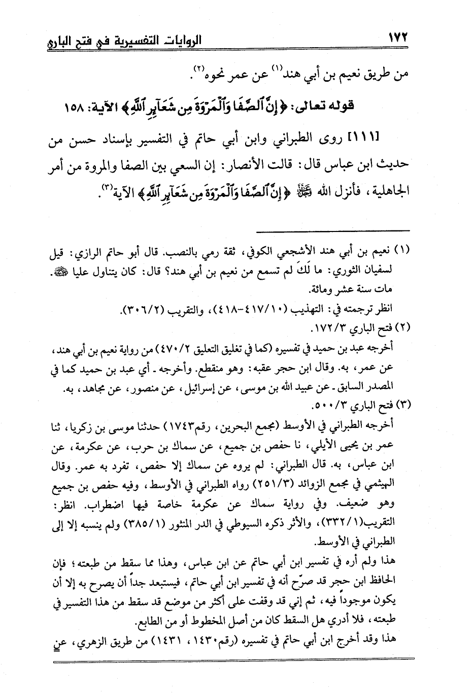 [111] روى الطبراني وابن أبي حاتم في التفسير بإسناد حسن من حديث ابن عباس قال: قالت الأنصار: إن السعي بين الصفا والمروة من أمر الجاهلية، فأنزل الله عز وجل {إِنَّ الصَّفَا وَالْمَرْوَةَ مِنْ شَعَائِرِ اللَّهِ} الآية3.