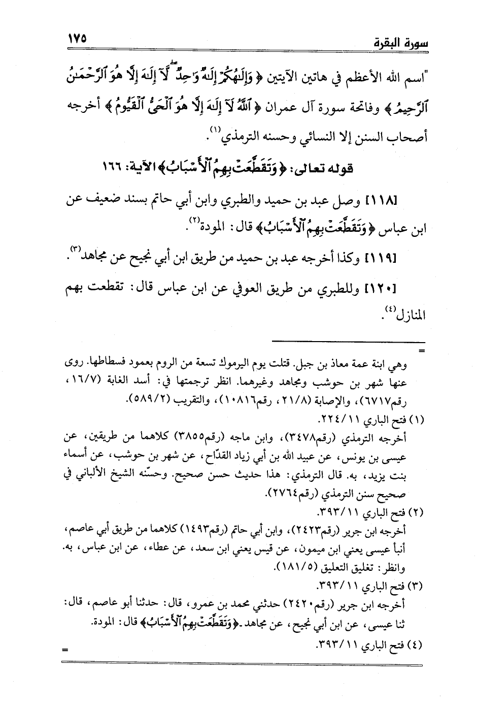 [118] وصل عبد بن حميد والطبري وابن أبي حاتم بسند ضعيف عن ابن عباس {وَتَقَطَّعَتْ بِهِمُ الْأَسْبَابُ} قال: المودة2.