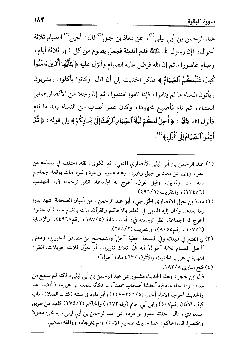 عبد الرحمن بن أبي ليلى1، عن معاذ بن جبل2 قال: أحيل3 الصيام ثلاثة أحوال، فإن رسول الله صلى الله عليه وسلم قدم المدينة فجعل يصوم من كل شهر ثلاثة أيام، وصام عاشوراء. ثم إن الله فرض عليه الصيام وأنزل عليه {يَا أَيُّهَا الَّذِينَ آمَنُوا كُتِبَ عَلَيْكُمُ الصِّيَامُ} فذكر الحديث إلى أن قال "وكانوا يأكلون ويشربون ويأتون النساء ما لم يناموا، فإذا ناموا امتنعوا، ثم إن رجلا من الأنصار صلى العشاء، ثم نام فأصبح مجهودا، وكان عمر أصاب من النساء بعد ما نام فأنزل الله عز وجل: {أُحِلَّ لَكُمْ لَيْلَةَ الصِّيَامِ الرَّفَثُ إِلَى نِسَائِكُمْ} إلى قوله: {ثُمَّ أَتِمُّوا الصِّيَامَ إِلَى اللَّيْلِ} 4.