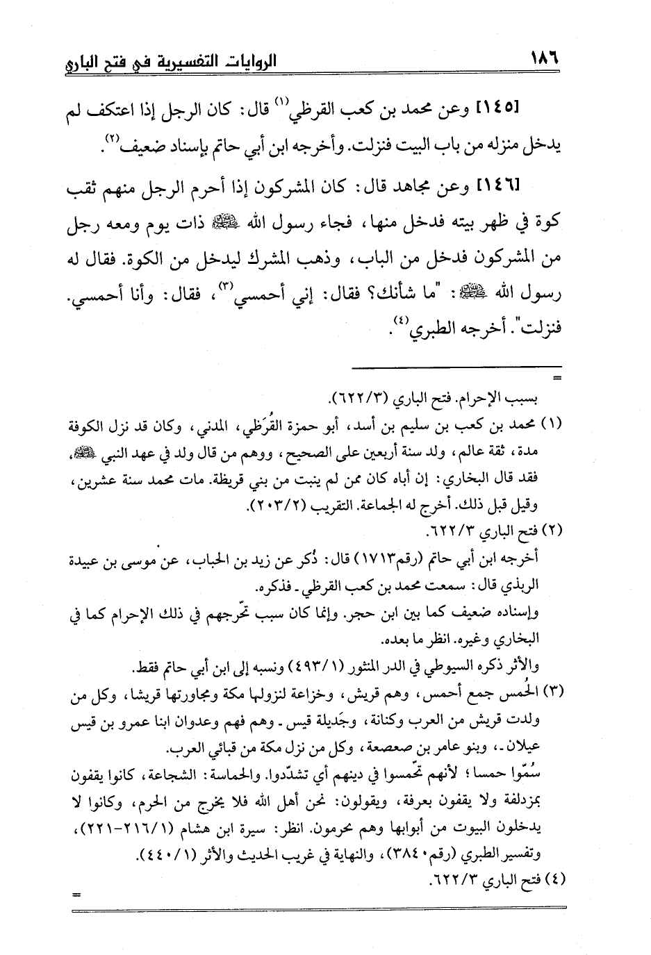[145] وعن محمد بن كعب القرظي1 قال: كان الرجل إذا اعتكف لم يدخل منزله من باب البيت فنزلت. وأخرجه ابن أبي حاتم بإسناد ضعيف2.