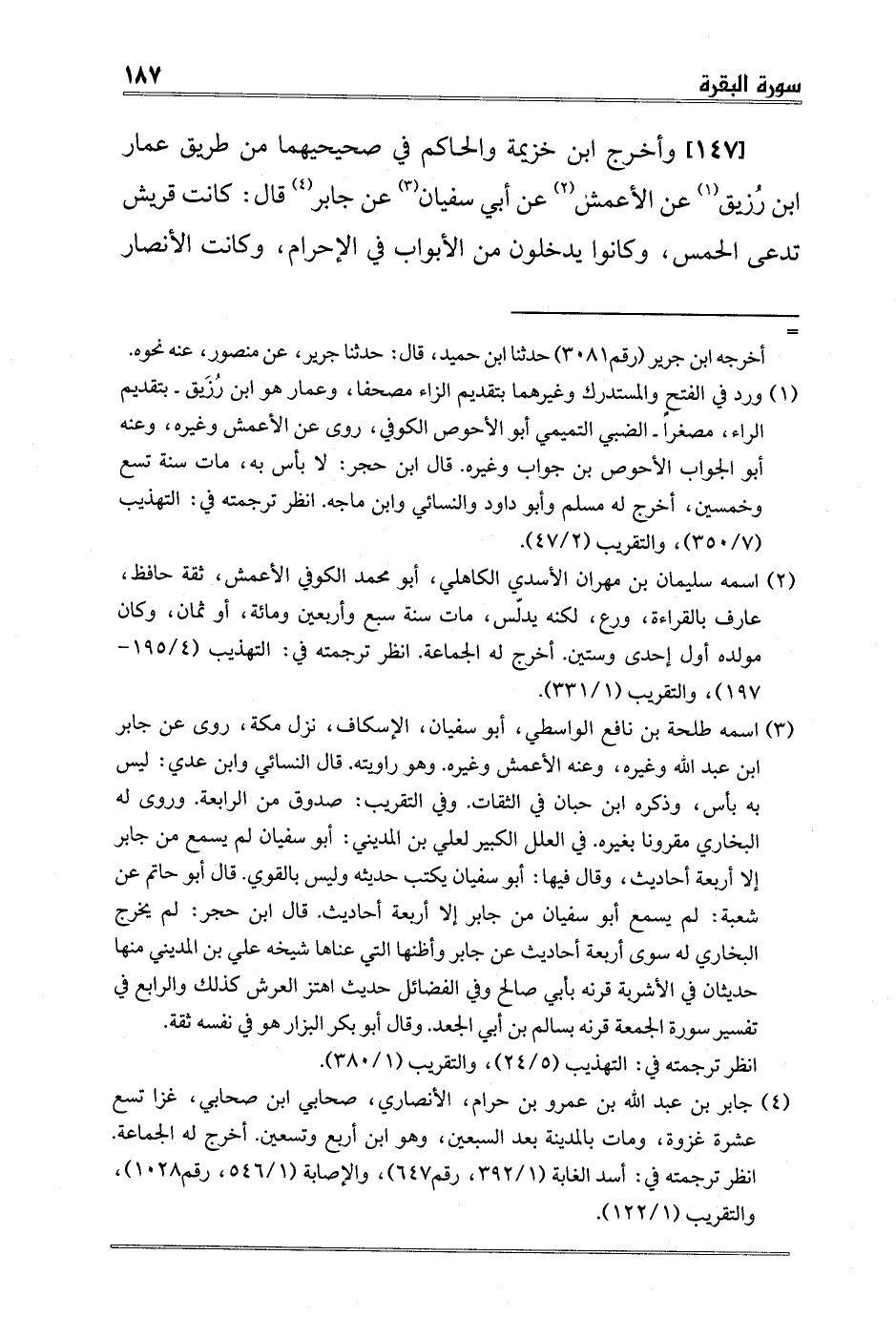 [147] وأخرج ابن خزيمة والحاكم في صحيحيهما من طريق عمار ابن رُزيق1 عن الأعمش2 عن أبي سفيان3 عن جابر4 قال: كانت قريش تدعى الحمس، وكانوا يدخلون من الأبواب في الإحرام، وكانت الأنصار