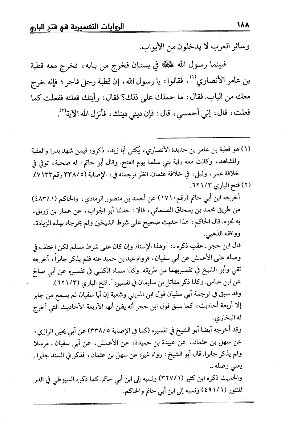قال ابن حجر - عقب ذكره -: "وهذا الإسناد وإن كان على شرط مسلم لكن اختلف في وصله على الأعمش عن أبي سفيان، فرواه عبد بن حميد عنه فلم يذكر جابراً، أخرجه تقي وأبو الشيخ في تفسيريهما من طريقه. وكذا سماه الكلبي في تفسيره عن أبي صالح عن ابن عباس. وكذا ذكر مقاتل بن سليمان في تفسيره ". فتح الباري 3/621.